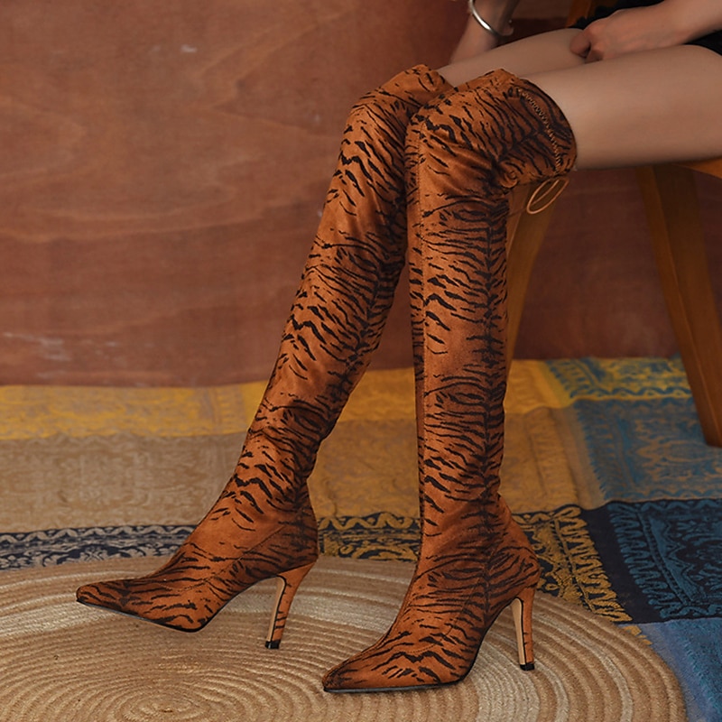 Featuring a pointed toe, these boots exude contemporary flair. The over-the-knee design combined with a thin stiletto heel offers a chic and stylish appeal. Available in diverse patterns such as leopard and tiger, they make a bold statement and add unique style to your outfit.