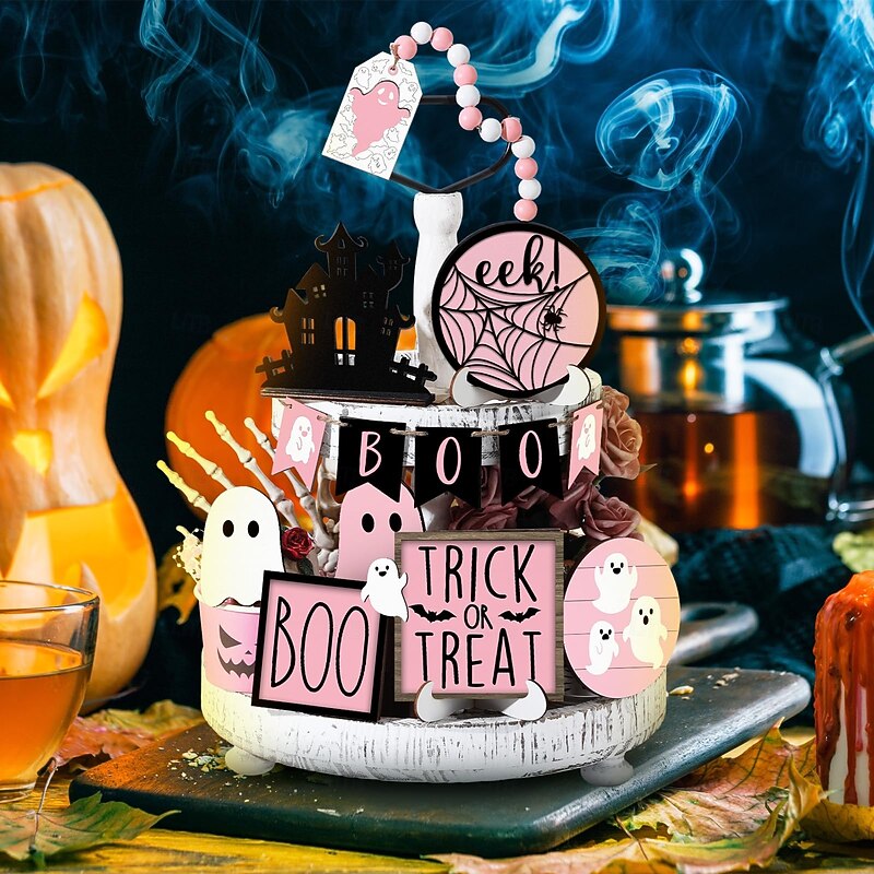 HOT ! 15-Piece Halloween Pink Tiered Tray Decor Set, Cute Ghost Wooden Signs and Farmhouse Style Decorations for Home, Table, and Party Supplies