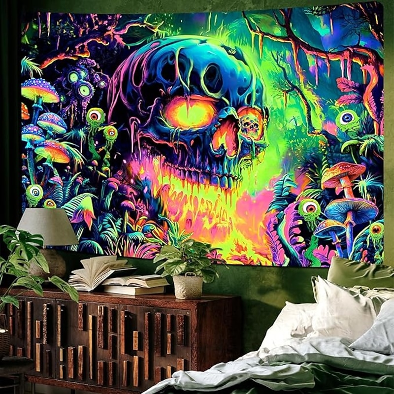 HOT ! Neon Jungle Skull Blacklight Tapestry – Trippy Horror Wall Art for Psychedelic Room or Halloween Party Decor