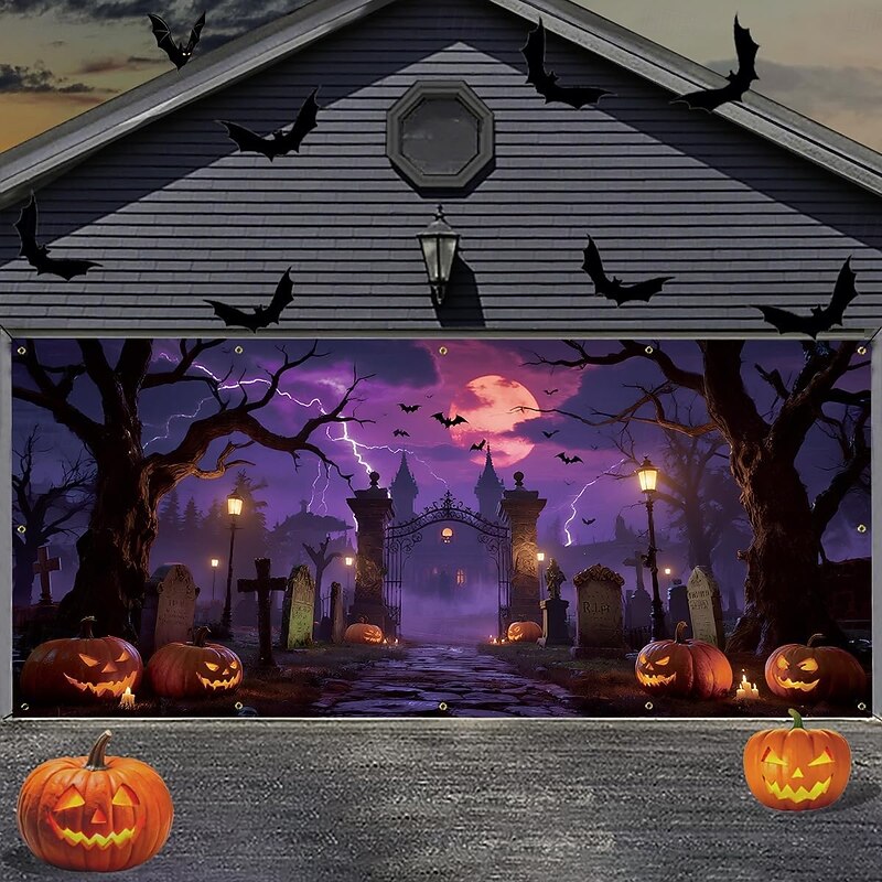 Halloween Garage Door Cover Large Hanging Backdrop Pumpkin Dark Punk Gothic Style Party Outdoor Shooting Backgrounds Yard Haunted House Home Decor 9