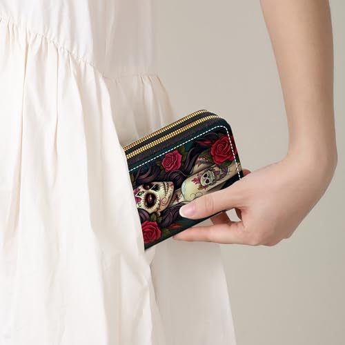 HOT ! Sugar Skull Girl Roses Print Wallet for Women with Credit Card Holder Coin Money Clip PU Leather Double Zip Around Clutch Wallet