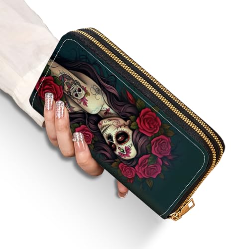 Sugar Skull Girl Roses Print Wallet for Women with Credit Card Holder Coin Money Clip PU Leather Double Zip Around Clutch Wallet 1