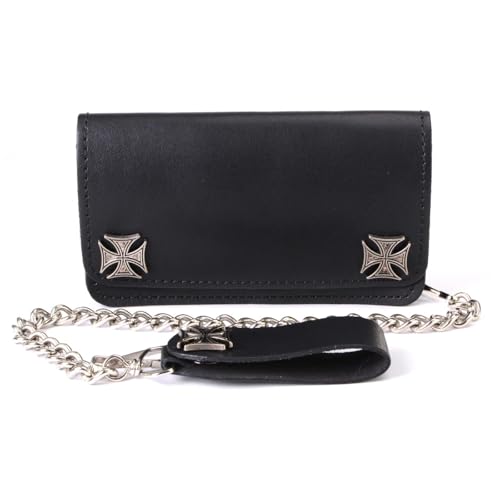 Milwaukee Leather MLW7825 Men's 6” Black Leather Bi-Fold Biker Wallet w/Anti-Theft Stainless Steel Chain and Iron Cross Emblems - 6 Inch