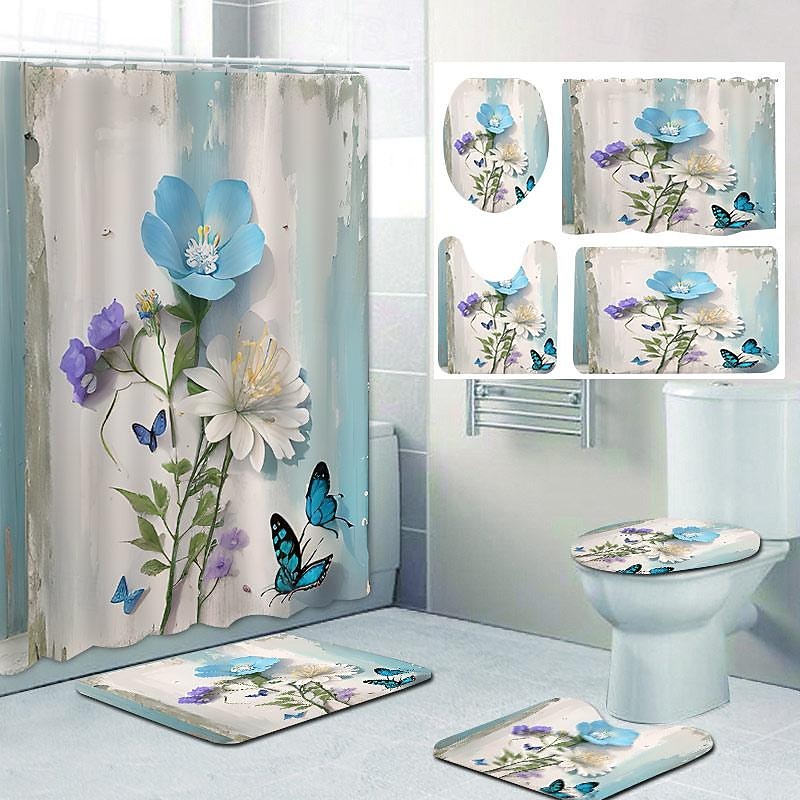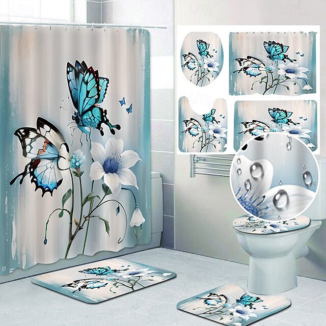 HOT ! Butterfly Bathroom Deco 4 Pcs Shower Curtain Set 180cm*180cm(70"*70") Bathroom Sets Modern Home Bathroom Decor with Bath Mat U Shape and Toilet Lid Cover Mat 12 Hooks