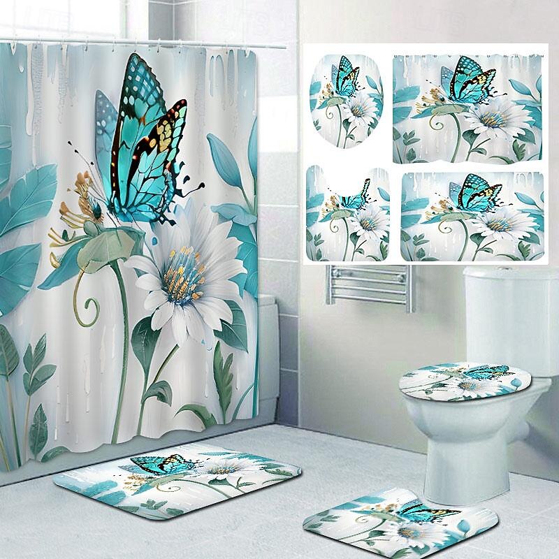 Butterfly Bathroom Deco 4 Pcs Shower Curtain Set 180cm*180cm(70"*70") Bathroom Sets Modern Home Bathroom Decor with Bath Mat U Shape and Toilet Lid Cover Mat 12 Hooks 5