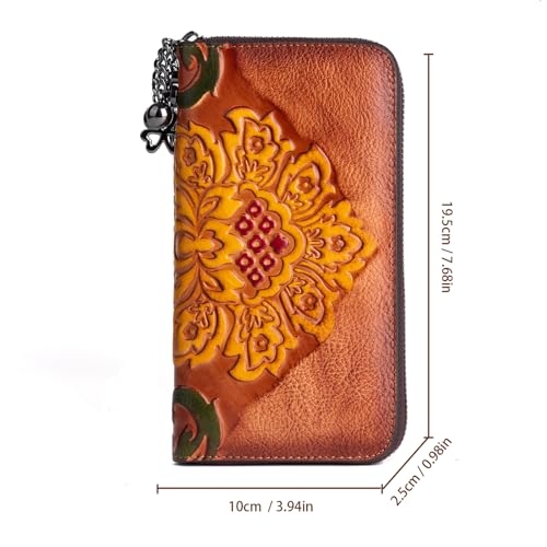 Women Long Wallet Vintage Embossing Ethnic Style Card Holder Genuine Leather Clutch Large Capacity Multi Pocket Purse