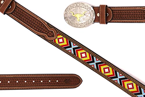 Embroidery Fabric Belt Aztec Print Men Women Cowboy Genuine Leather 1