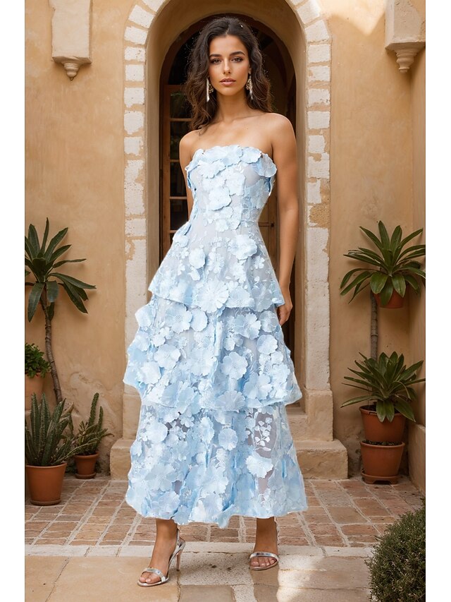 A-LineCocktail Dresses Tiered Dress Semi Formal Wedding Midi Length Sleeveless Off Shoulder with Floral Embroidered Lace Appliques 1