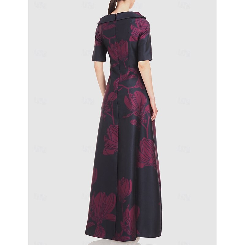 A-Line Evening Gown Elegant Dress Formal Wedding Floor Length Half Sleeve Shirt Collar Pocket Satin with Floral Print 1