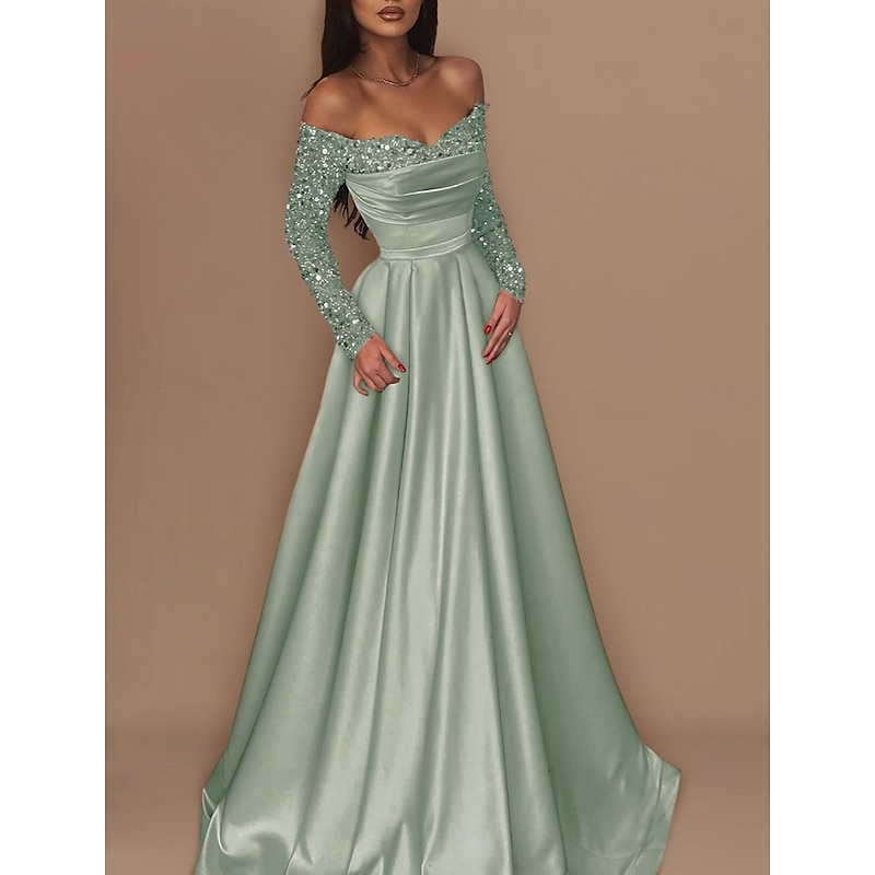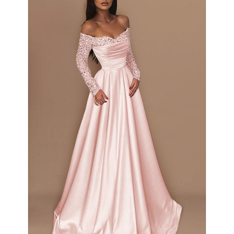 Ball Gown Gold Evening Gown Hot Dress Engagement Wedding Reception Sweep / Brush Train 3/4 Length Sleeve Off Shoulder Satin with Sequin 1