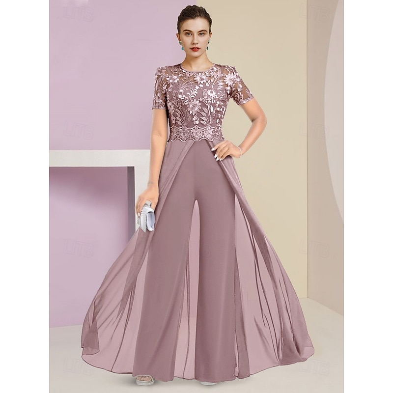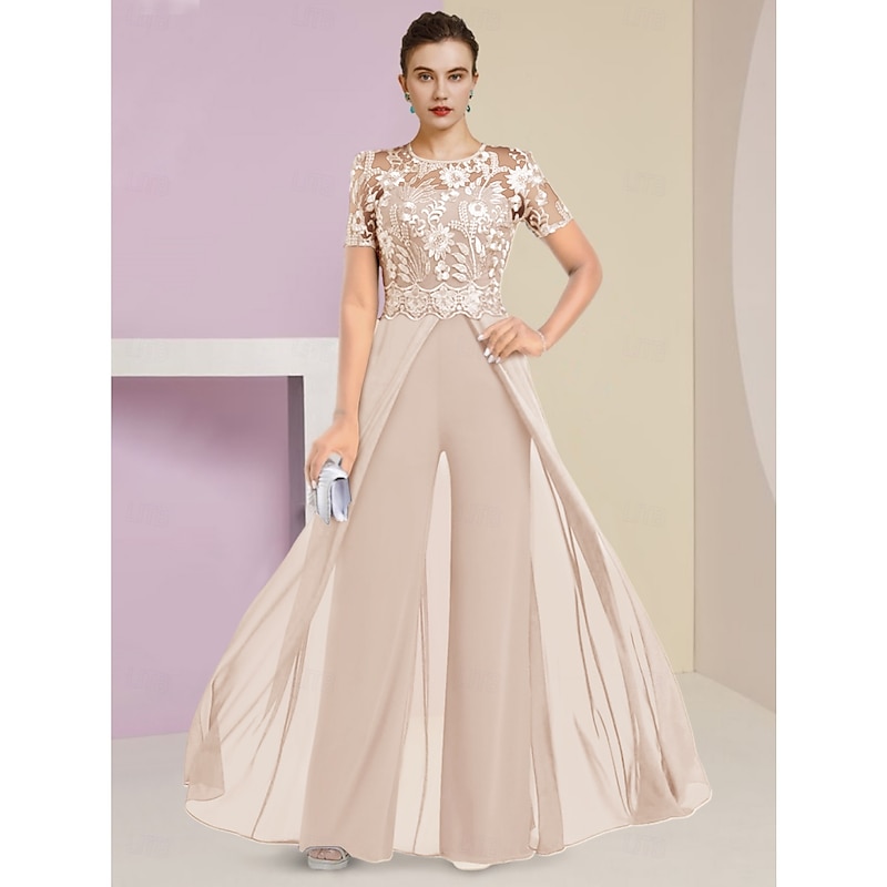 More information about Beach Wedding Jumpsuit Mother of the Bride Wedding Guest Elegant Jewel Neck Ankle Length Stretch Chiffon Short Sleeve with Lace Pleats