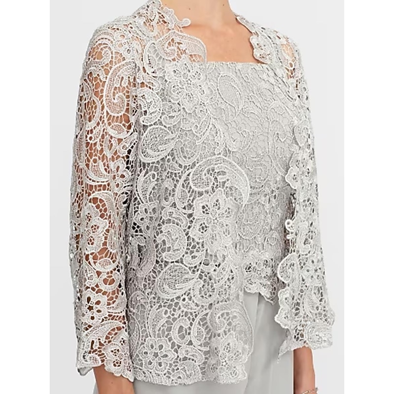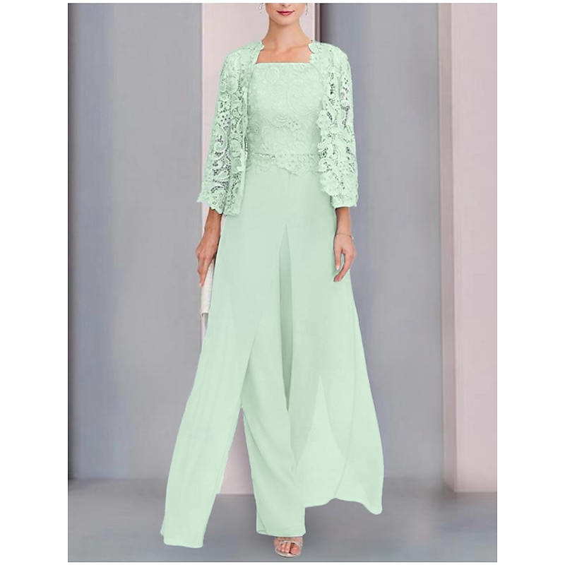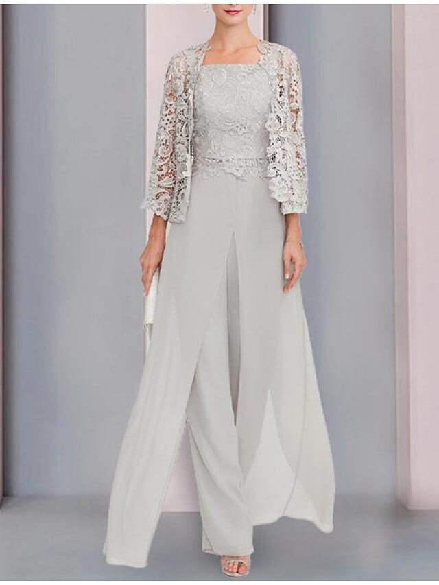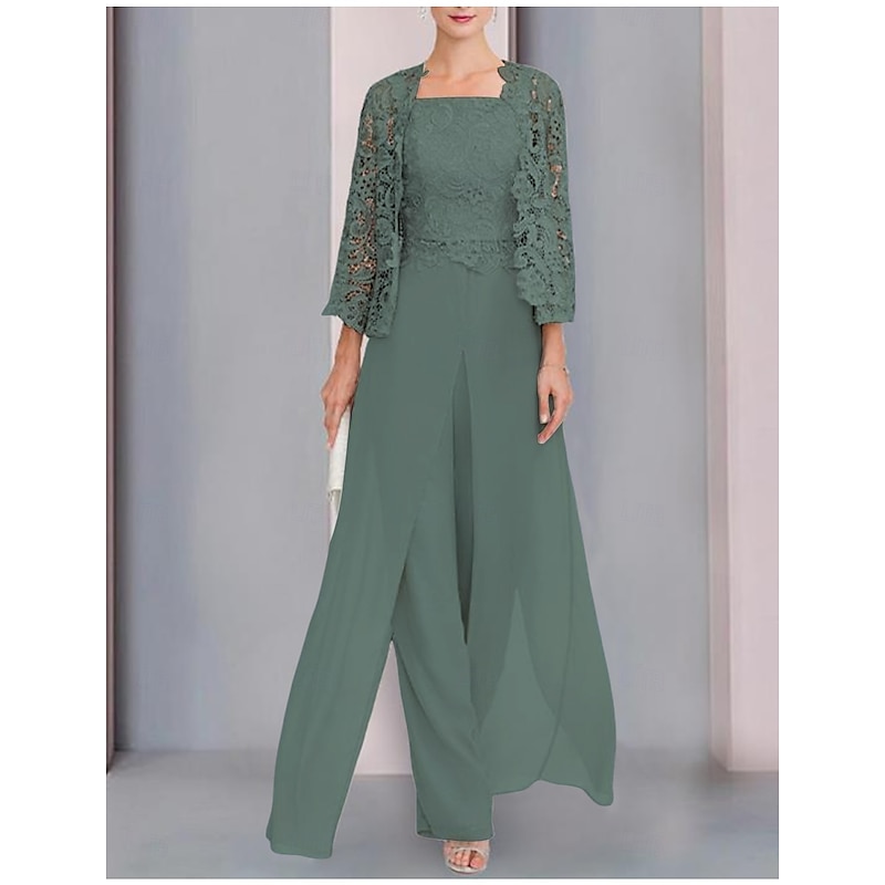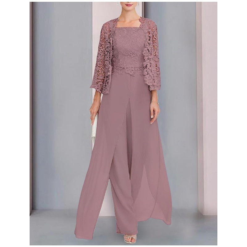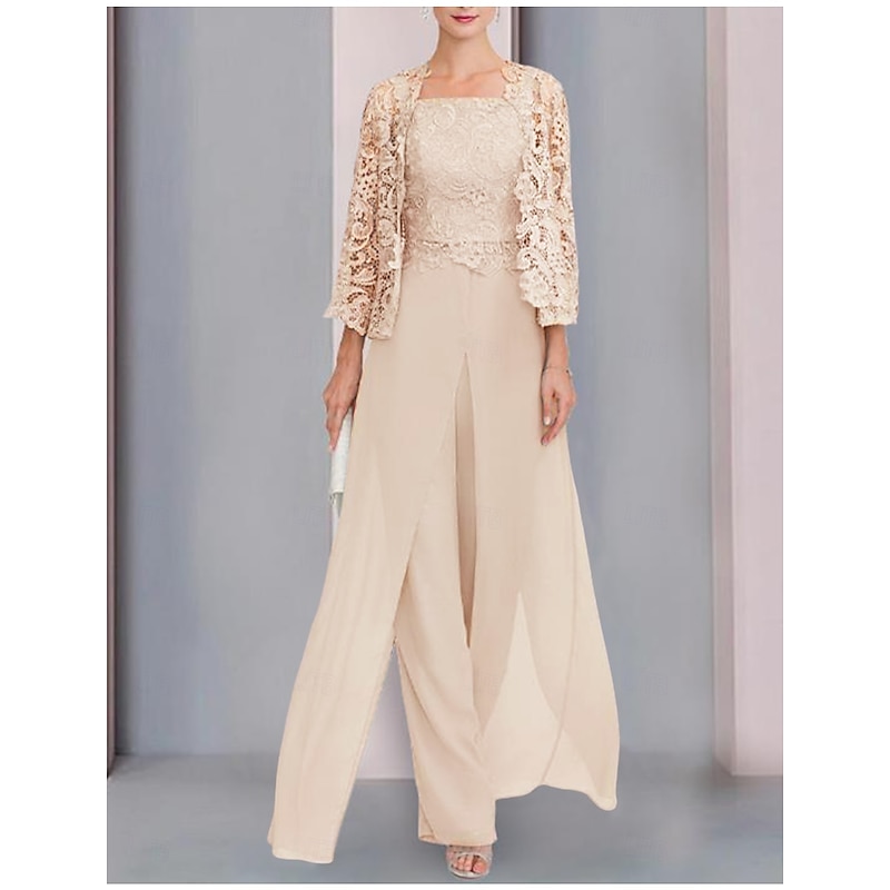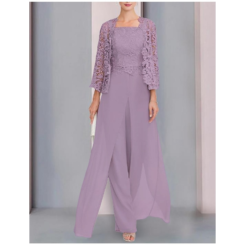 More information about Pantsuit 3 Piece Mother of the Bride Formal Wedding Guest Elegant Wrap Included Square Neck Floor Length Chiffon Lace Sleeveless Wrap Included with Appliques