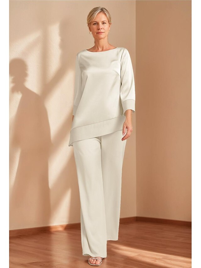 Why Choose Pantsuit Mother of the Bride Elegant Simple Minimalist Boat Neck Floor Length Satin 3/4 Length Sleeve Wrap Included with Solid Color?