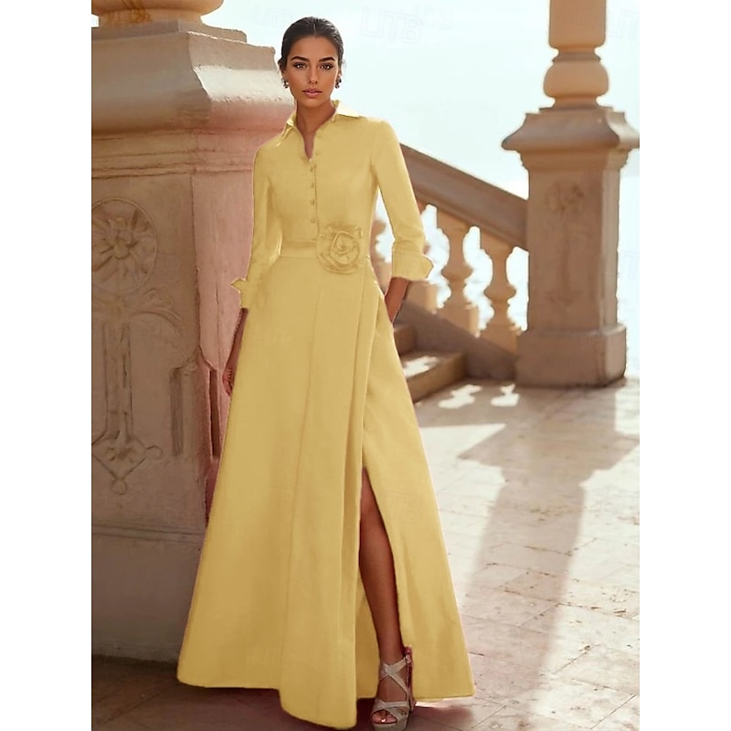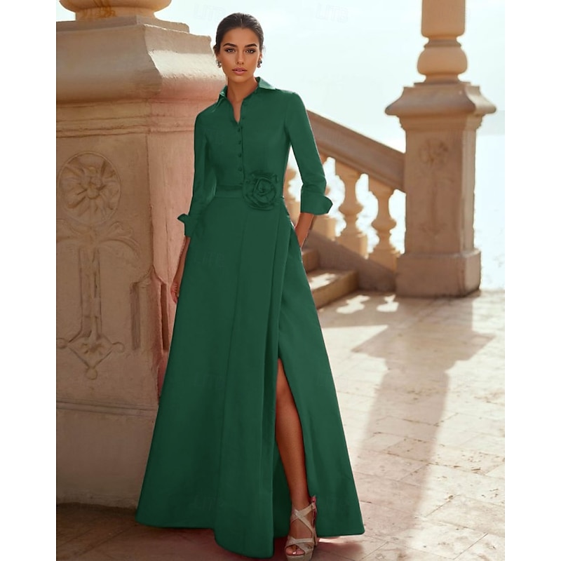 Why Choose A-Line Mother of the Bride Evening Gown Elegant Dress Formal Wedding Floor Length 3/4 Length Sleeve Shirt Collar Pocket Taffeta with Slit?