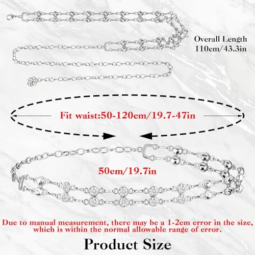 • 【Adjustable & Perfectly Fitting】The rhinestone chain belt length 130cm/51inch; Fit Waist Size: 65-125cm/25-49 inch. This crystal chain belt features a lobster clip that can be easily adjusted to the waistline for a comfortable fit all day. It accentuates your curves beautifully, providing a flattering look.