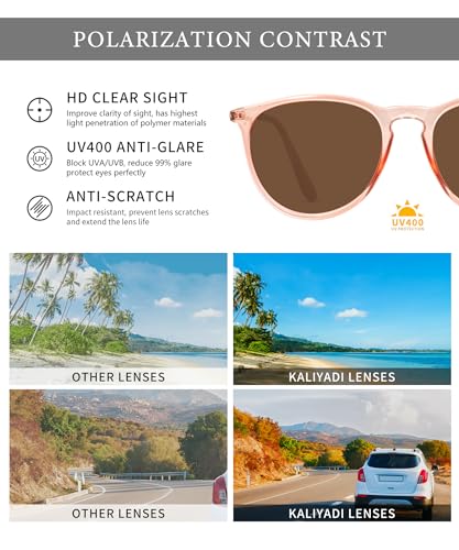 • ◆ Trendy Round Design - KALIYADI womens sunglasses adopts a retro round frame design, which makes you stand out from the crowd. These polarized sunglasses women add glamor to any outfit and are a must-have accessory for any fashion forward woman. Our round sunglasses womens trendy come in a variety of frame and lens colors, making them a great choice for your everyday fashion accessory.