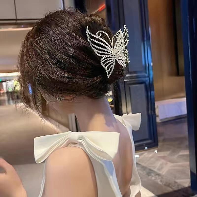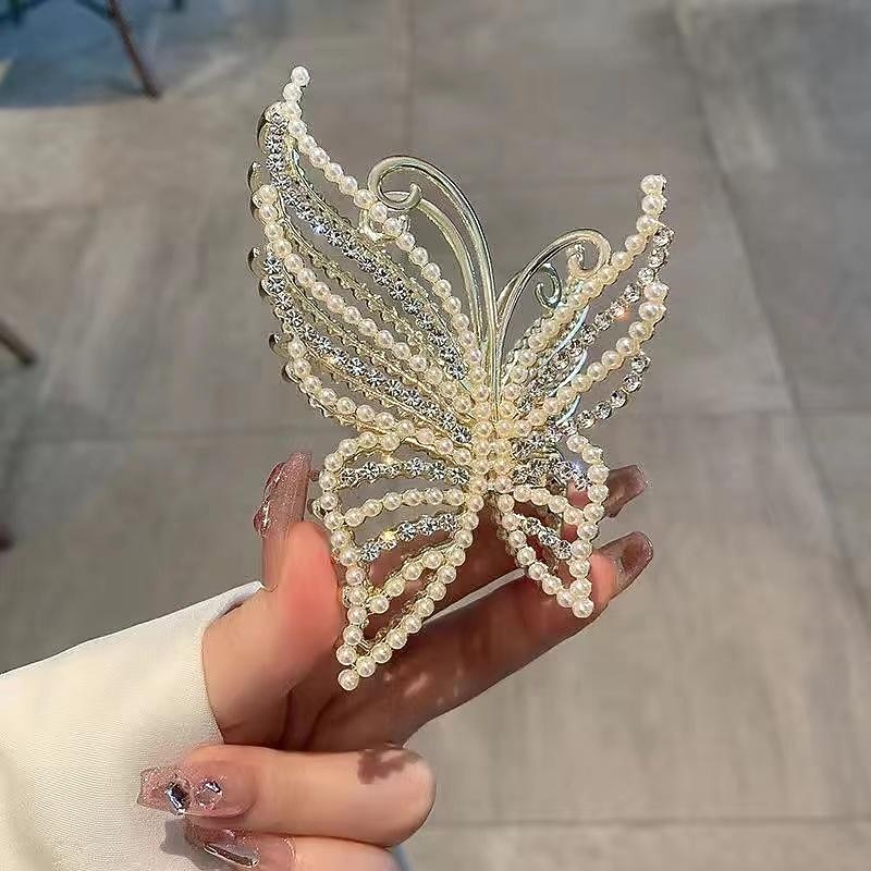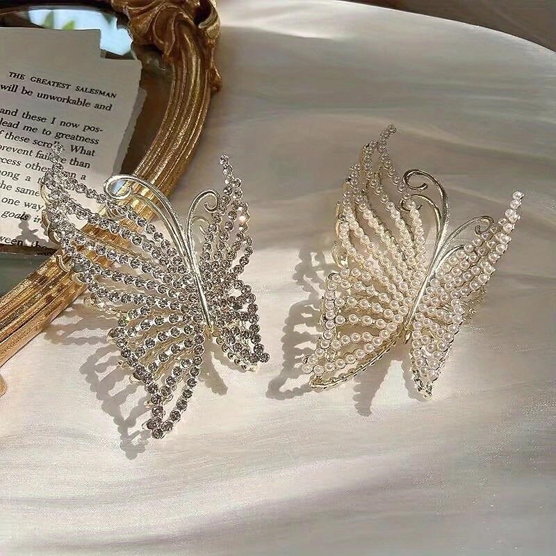 HOT ! Butterfly Crystal Hair Claw Clips Pearl Rhinestone Golden Metal Hair Clips Large Gem Hair Jaw Clips Strong Hold Non-Slip Hair Catch Barrettes Clamps For Thick And Thin Hair Accessories For Women Girls
