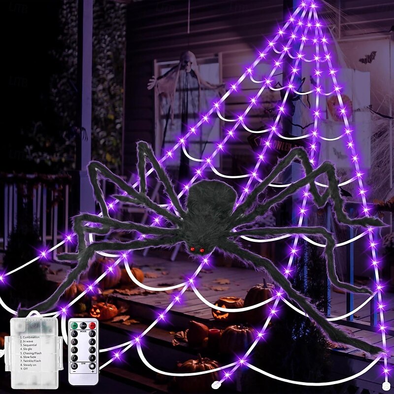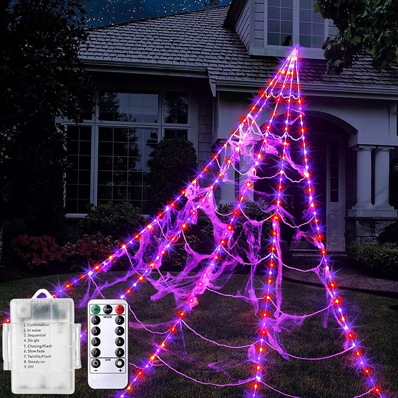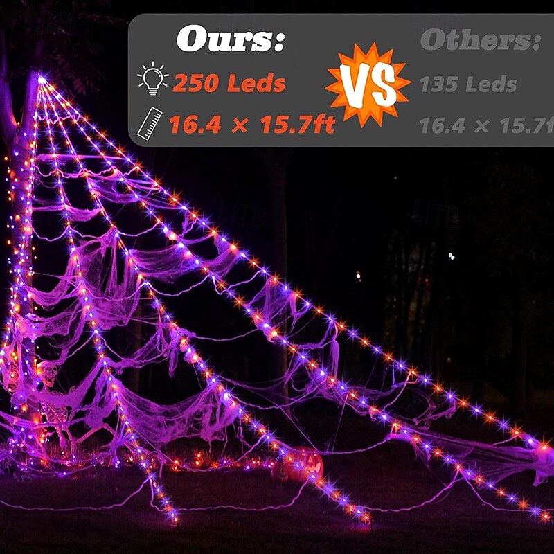 Why Choose 1 Pc Halloween 5M * 4.8M triangular luminous web lamp purple orange AAA waterproof battery box remote control 250 LED beads indoor and outdoor courtyard decoration lights (excluding spiders)?