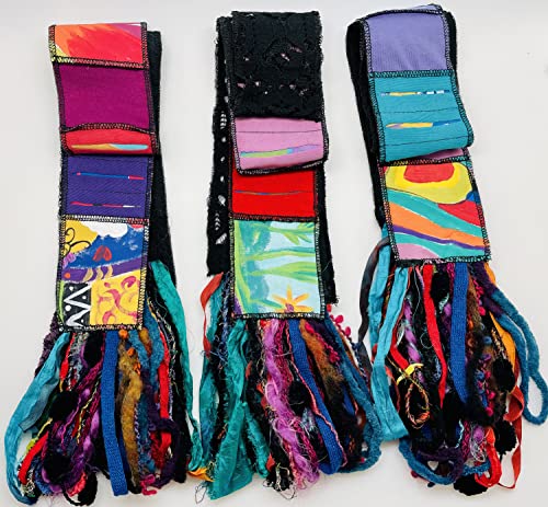 Fabric type: Cotton, Poly lace, assorted hand dyed yarns and ribbonsThis unique brightly colored infinity scarf is handmade by textile designer Lynn Reiter Weinberg in her GA. Studio using recycled hand painted cotton and knit fabrics and assorted yarns from her 35 years designing the Silkscapes and LRW Designs clothing collections. It is light and ideal for women who love the look of statement necklaces and fashion scarves, but without the warmth, bulk or weight around their neck. Versatile and perfect for any season and any occasion.The back portion of this scarf is made from upcycled hand painted cotton and knit fabrics that are carefully laid out and then sewn together using an overcast stitch to create one side and the other side is poly black lace. Three of the sections have knit fabric with slit cutouts showing hand painted fabric below. Attached to the 2 complimentary fabric sections are 15 colorful assorted hand dyed yarns and ribbons that are 10” long.The pieced fabric section reverses to black for added versatility and there are 5 different looks you can create. Simply wrap it around your neck twice or more on either the colorful or black side. You can also fold it in half laying the fabric sections on top of each other and the yarn sections on either end. Then drape it around the neck and put one through the yarn loops.Whether you're dressing up a casual ensemble or adding the finishing touch to something special you will add a dash of artistry to your look. Due to the diversity of the yarns and fabrics items will vary slightly in coloration. Color and texture layered side by side make each one of these scarves a one of a kind treasure. It is light enough to wear every season which makes it perfect for travel.DIMENSIONS: 2 x 70 CARE: Hand wash cold, hang to dry, spot or dry clean Perfect for everyday use. High quality materials and excellent craftsmanship ensure long-lasting durability.