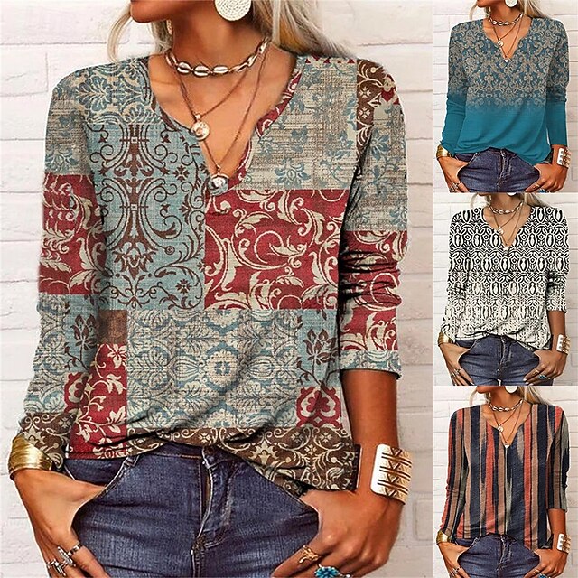 HOT ! Women's Shirt Blouse Flower Modern Casual Long Sleeve V Neck Regular Tops Daily Going out Print White Red Blue Orange Summer