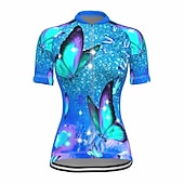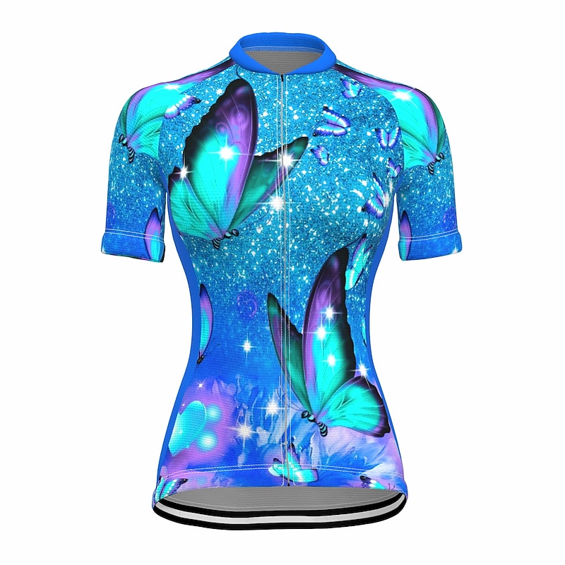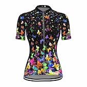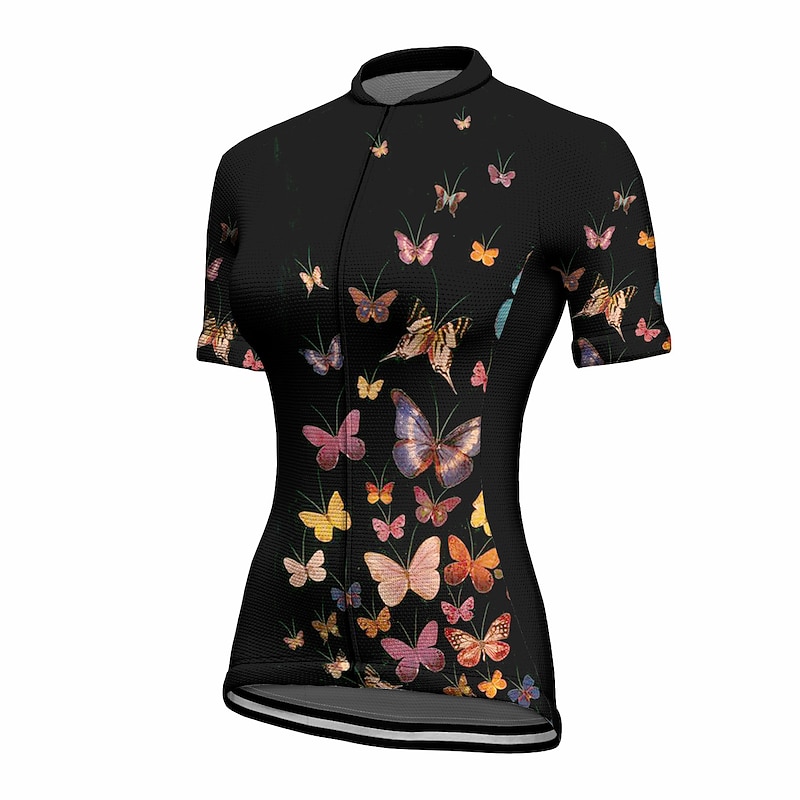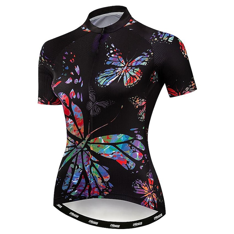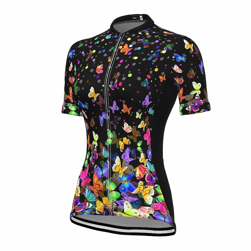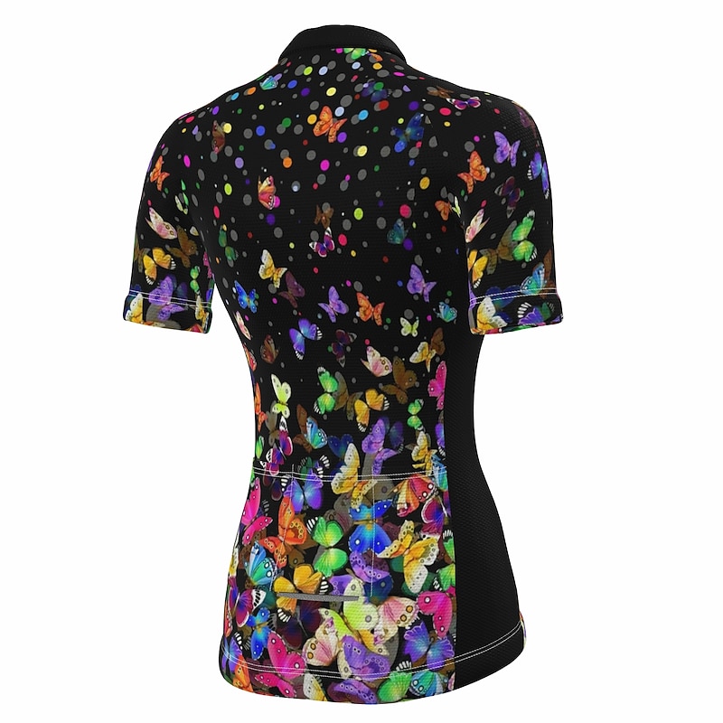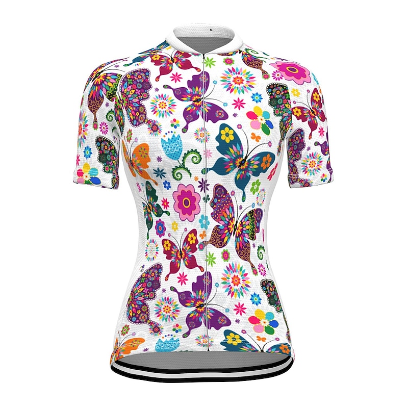 Highlights - Classic 3 back pockets provide ample storage space for your wallet, maps, and snacks when cycling. - The quick-dry fabric used in this cycling jersey with short sleeves offers excellent moisture management to keep you dry and comfortable during your rides. - No need to worry about sliding or bunching up thanks to the anti-slip silicone hem and high elastic tricot fabric cuffs, which have a certain degree of anti-skid function. - The reflective stripe on this women's cycling shirt ensures visibility, which helps to keep you safe when cycling in dark conditions and avoid traffic accidents. - The stretchy material also makes it suitable for a variety of athletic and leisure activities, making it a great addition to any wardrobe. - This butterfly patterned cycling jersey is suitable for both mountain bike MTB and road bike cycling disciplines, making it a versatile choice for any cyclist.
