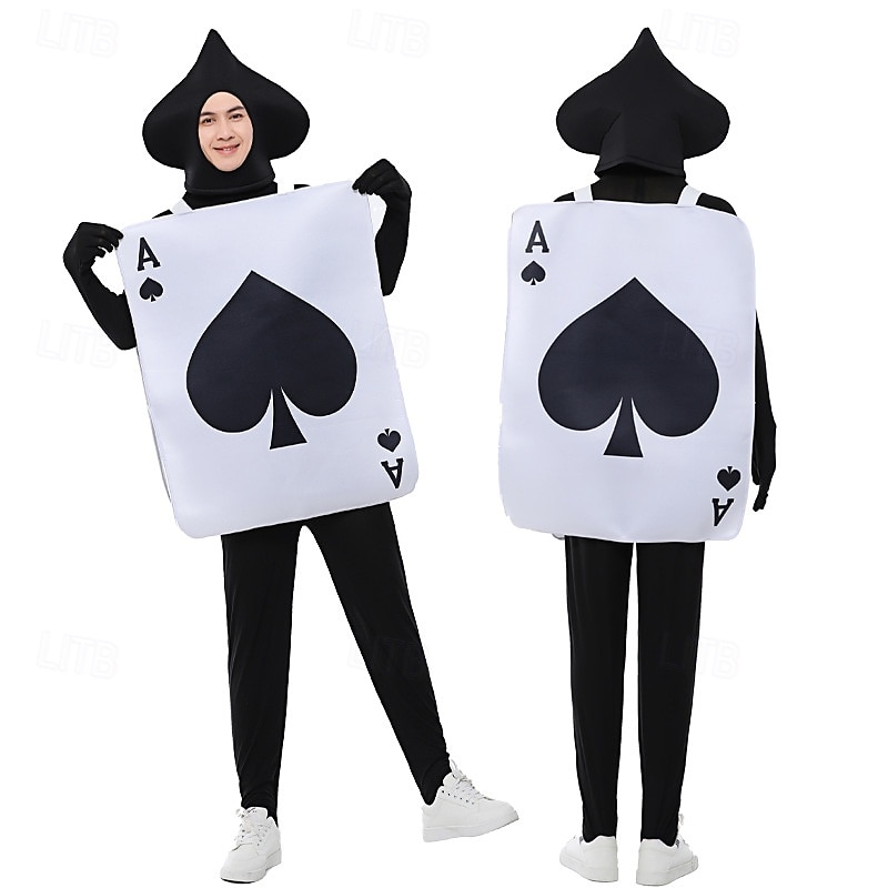 Highlights [Fabric] : Crafted from a blend of polyester and spandex, these costumes offer a comfortable and stretchy fit that is both durable and flexible. The lightweight fabric ensures ease of movement, making it ideal for long wear during festive occasions. [Fit] : Featuring a full-body suit design, the base layer includes a form-fitting top and leggings that hug the body comfortably, providing a sleek and flexible silhouette. This form-fitting design accommodates various body types due to the stretchy nature of the fabric. [Design Highlights] : Inspired by the classic Alice in Wonderland theme, these costumes resemble the iconic Ace of Hearts and Ace of Spades playing cards. The card-face overlays are vibrant and maintain their shape, featuring clear symbols on a smart white background. The Ace of Hearts includes red gloves and heart-shaped headgear, while the Ace of Spades comes with black gloves and spade-shaped headgear, enhancing the playful and whimsical look of the ensemble. [Occasions] : Perfect for Halloween parties, carnival events, themed group gatherings, or stage performances. These costumes offer a lively and captivating appearance that suits a variety of festive and interactive events, making them an excellent choice for those seeking to make a memorable impression. [Size] : Available in unisex sizes, these costumes accommodate both adults and children. The adult size fits individuals with a height range of 150-190 cm, while the children's size is suitable for heights between 120-150 cm. This range ensures a comfortable fit for a wide audience, making the costumes suitable for family or group costume themes.