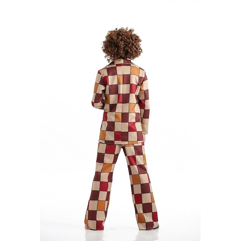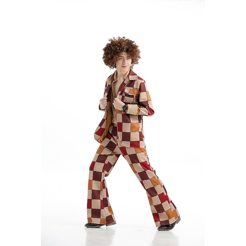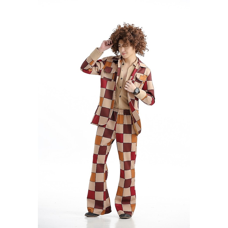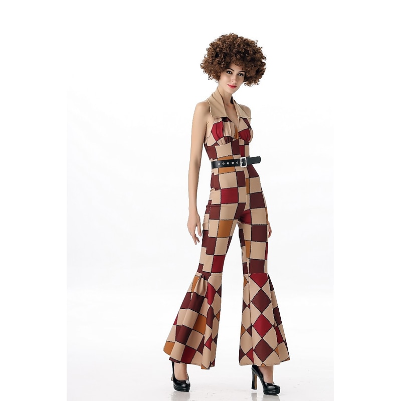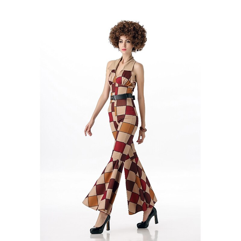 : Both costumes boast a bold checkered pattern in earthy tones of brown, beige, orange, and red, capturing the essence of vintage 70s fashion. The woman's halter neckline adds a touch of elegance, while the overall ensemble exudes a playful yet sophisticated retro vibe.