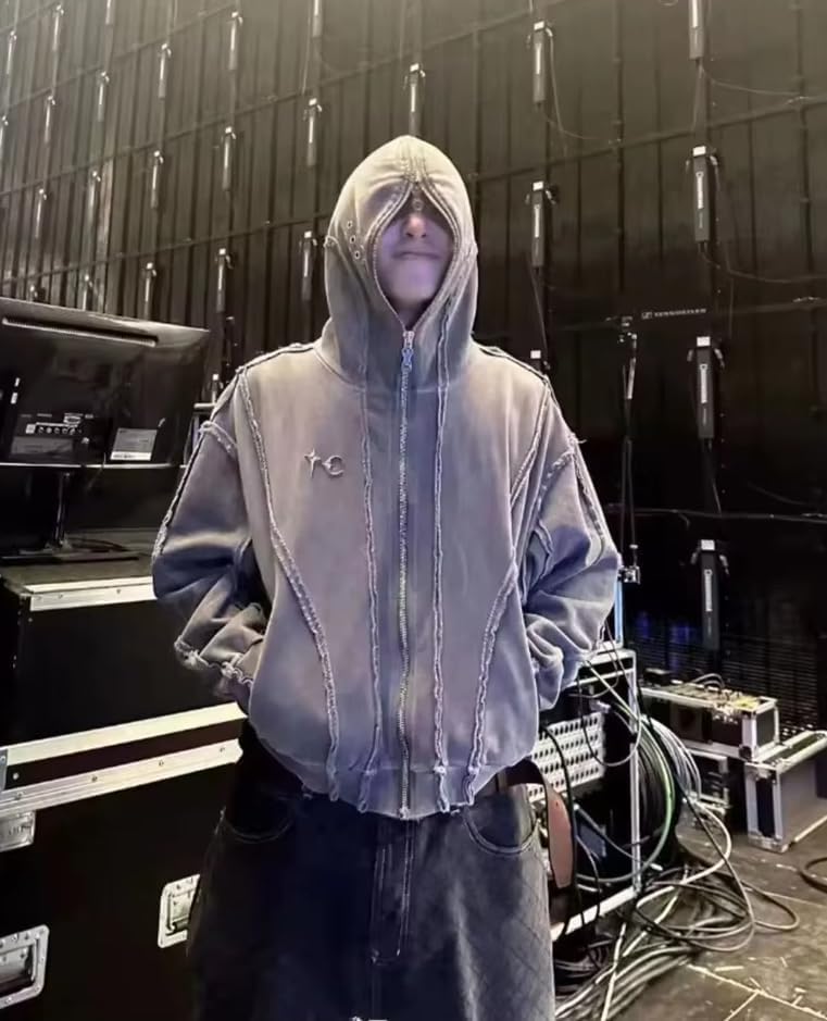 MOLERFO Men's Y2K Gothic Zip Up Hoodies Trendy Grinding Edge Masked Hoodies Hip-Hop Washed Jacket