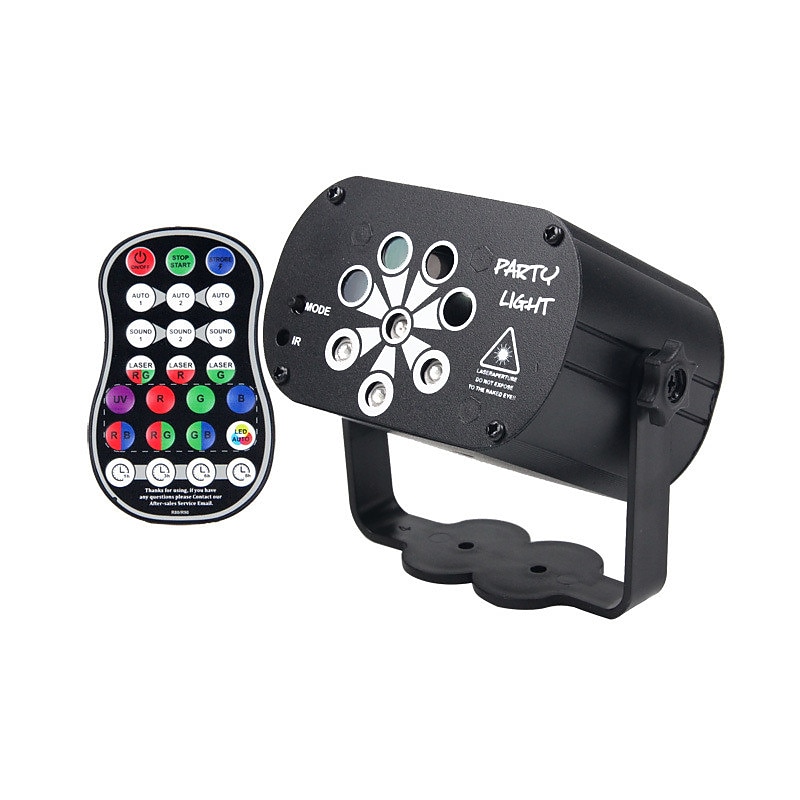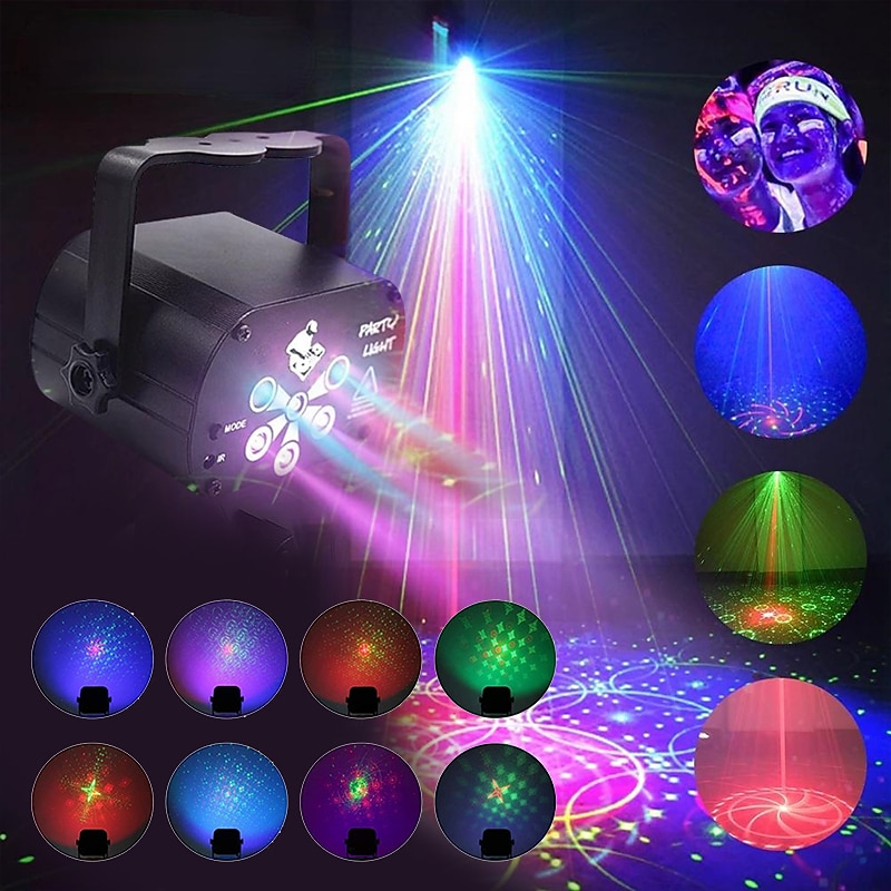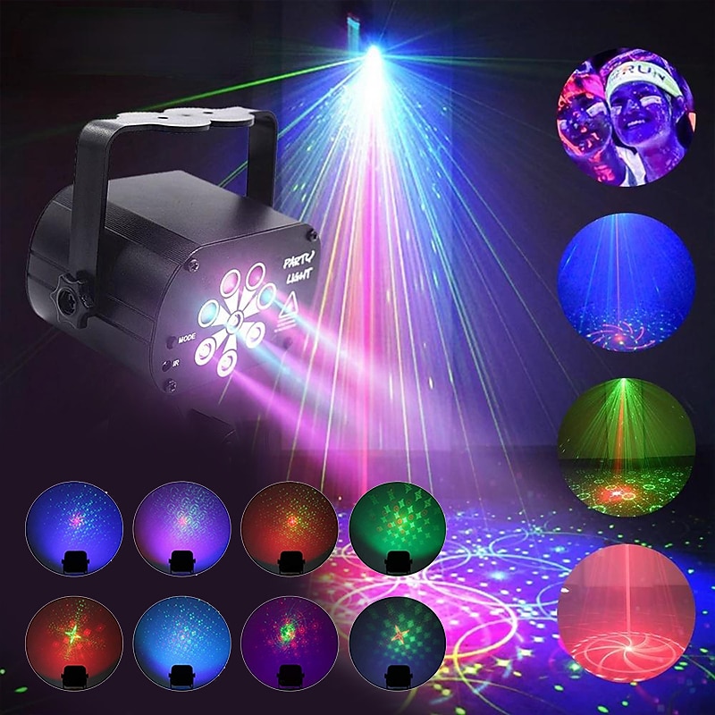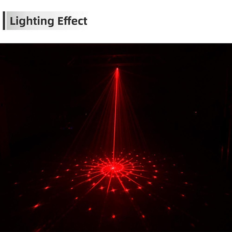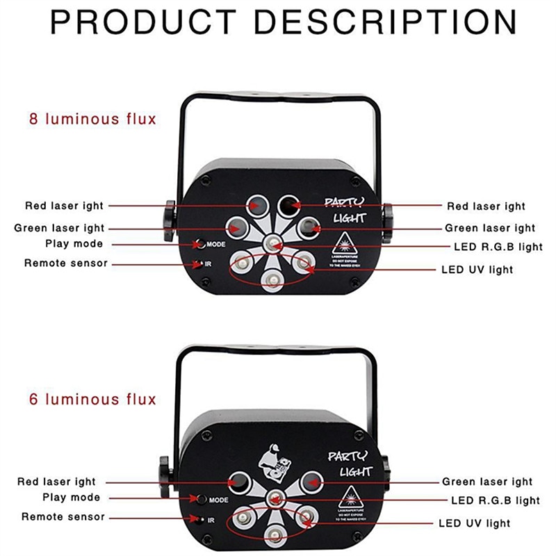 - Versatile lighting modes: Enjoy the flexibility to switch between flash, AUTO, sound-activated, red lightings, green lightings, red and green lightings, laser light, LED blue light, patterns, and more.