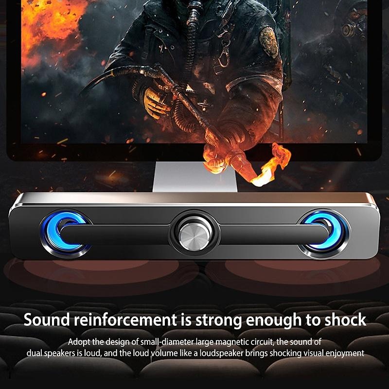 Highlights Product Selling Points: 1. Elegant Design: The blue LED light adds a touch of art and a cool metal texture, enhancing the aesthetic appeal of your desktop. 2. Convenient Volume Control: With the independent knob adjustment feature, you can easily increase or decrease the volume by simply turning the button. 3. Immersive Sound Experience: The speakers are designed with a small diameter and large magnetic circuit, resulting in a powerful and immersive sound effect. 4. Versatile Connectivity: The product features a 3.5mm audio interface, allowing you to connect via wired or Bluetooth connection for greater compatibility with various devices. 5. Easy and Simple Operation: Powered by USB, this speaker is extremely user-friendly and straightforward to operate, ensuring a hassle-free experience.