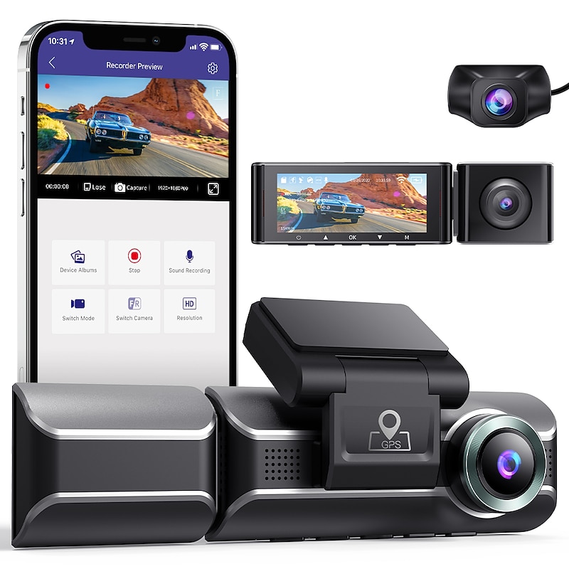 Highlights - Crystal clear 4K recording: Experience next-level recording with 4K UHD videos at 3840x2160p. Backed by Novatek NT96670 Processor and best-in-class GC4653 & Sony IMX307 & GC2053 Ultra-low light capture sensor. - Super night vision: F/1.8 wide aperture allows superior images, even in low light. Proprietary focal length technology facilitated by 6-Glass wide-angle lens helps in capturing smaller details like number plates with more accuracy. - 24-hour parking monitoring: 24-Hours Parking Monitor turns on and records a 1-min video when someone hits your car and the impact reaches the G-Sensor Level. It locks and saves the video. Please always connect the Dash Cam to an external power source. - Smart accident monitoring: The built-in G-sensor activates upon impact and records videos of up to 1 minute, providing precise emergency recording information. It dockets the file to aid further investigation. - Wide Dynamic Range (WDR) technology: Helps capture optimum lighting and image details, in both bright and dark conditions. Ensures clear visibility of road signs and license plates. - Motion detection technology: Activates the vehicle camera for recording when it senses any movement. Monitors both interior and exterior movements simultaneously. Enters standby mode automatically when motion stops. - Loop recording: Choose to record videos in loops of 3/5/10 minutes. Overwrites old videos when memory capacity is full. Features a screen saver with live speed, compass, and time. - Support Front & Cabin & Rear Camera - Track Driving Route with GPS-Tracking - Built-In Wi-Fi with Free AZDOME App - 4K Ultra-HD 3840x2160p resolution - Time-Lapse Video to save memory - Parking Mode, Motion Detection, Loop Recording. Perfect for everyday use. High quality materials and excellent craftsmanship ensure long-lasting durability.