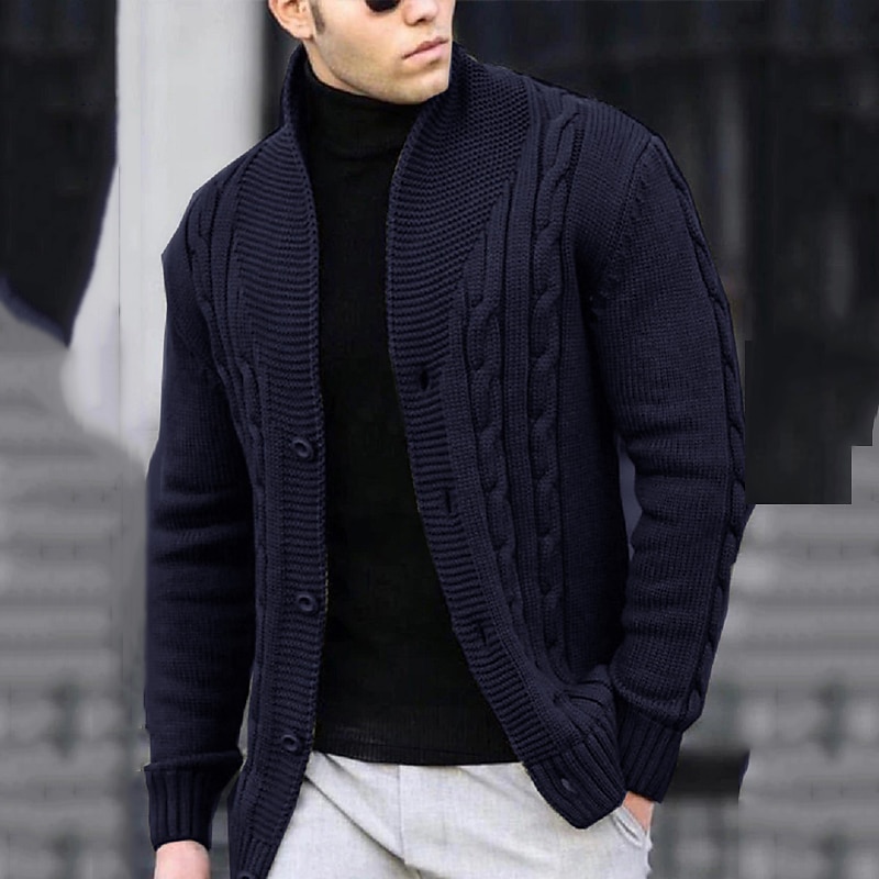 Highlights Product Selling Points: - Perfect for the fall and winter seasons - Long sleeves provide warmth and comfort - Specifically designed for men - Features a button-up design for easy wear - Stylish lapel neckline adds a touch of sophistication - Knit style with cable pattern for a trendy look