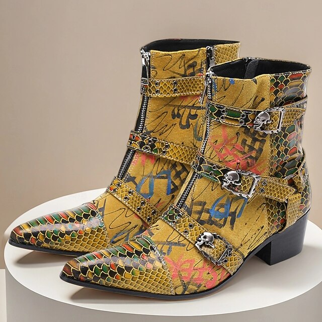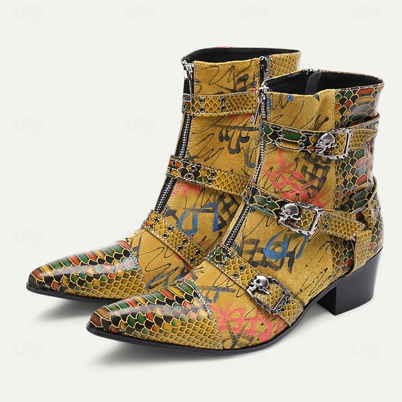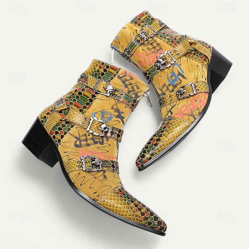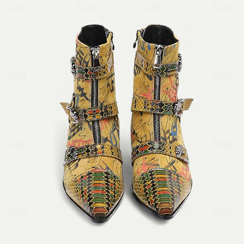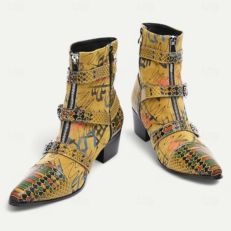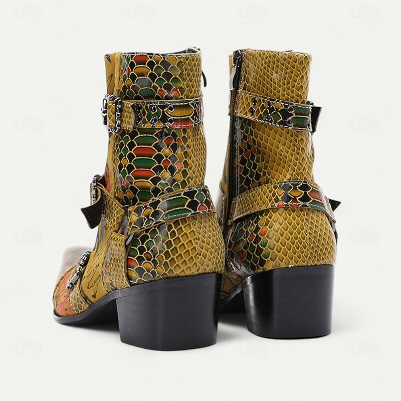 More information about Men's Bold Snake Print Leather Boots – Yellow Multicolor Genuine Cowhide with Triple Buckle Straps, Pointed Toe for Stage Shows, Festivals and Party Outfits
