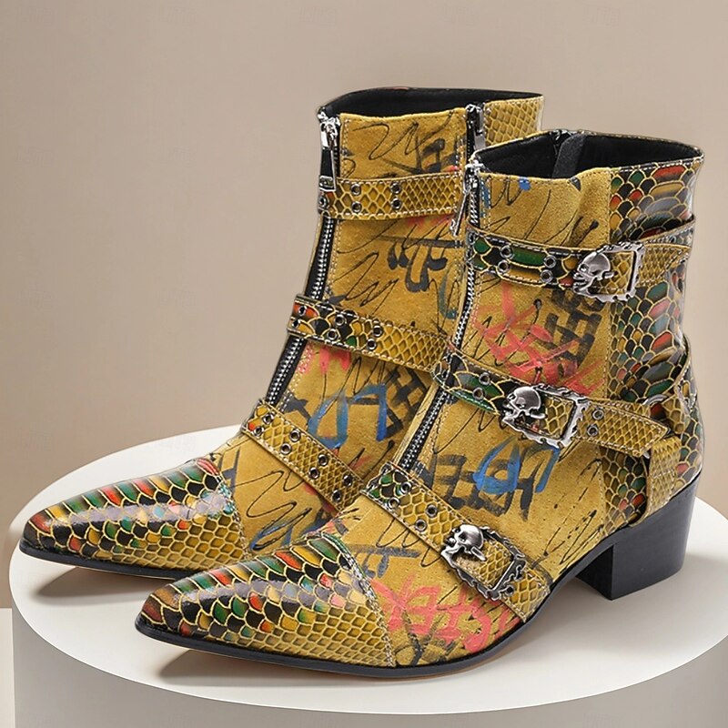 Men's Bold Snake Print Leather Boots – Yellow Multicolor Genuine Cowhide with Triple Buckle Straps, Pointed Toe for Stage Shows, Festivals and Party Outfits 1