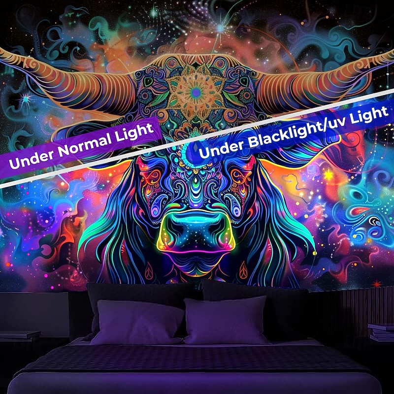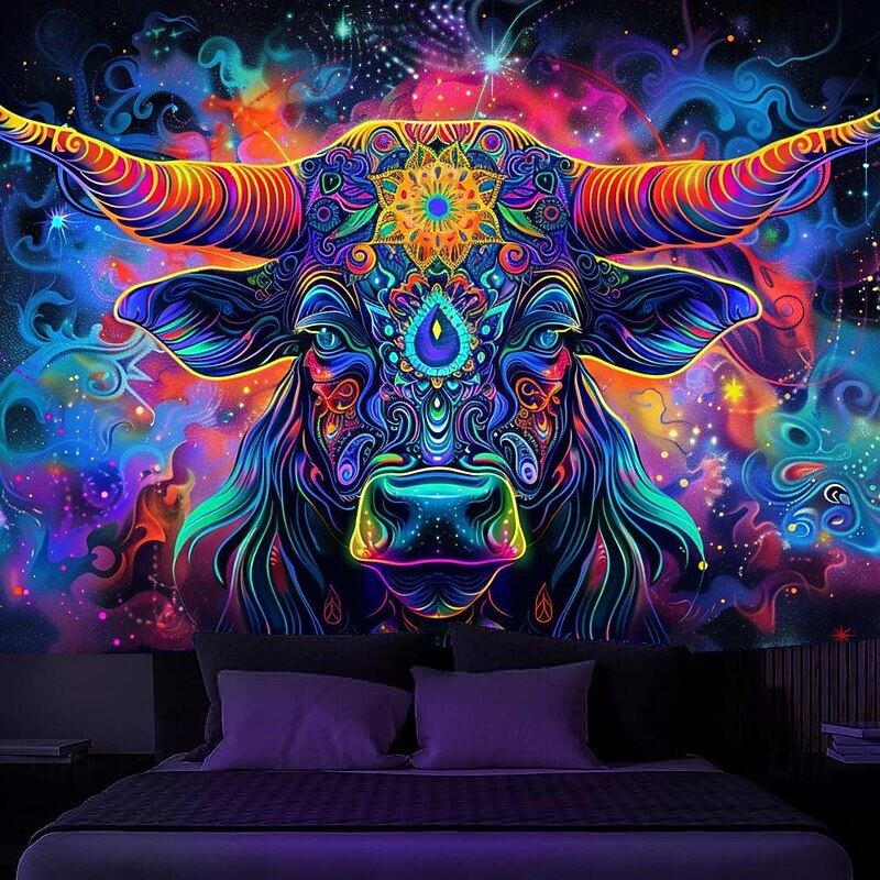 Blacklight Tapestry UV Reactive Glow in the Dark Glow Party Neon Bull Animal Psychedelic Trippy Misty Hanging Tapestry Wall Art Mural for Living Room Bedroom