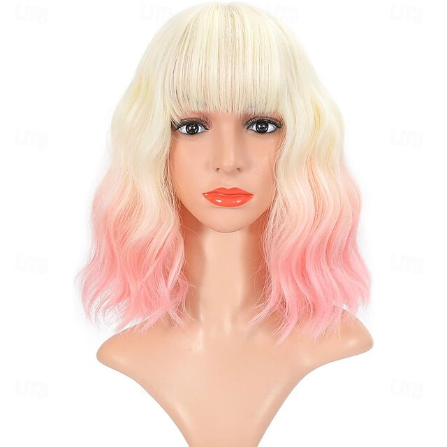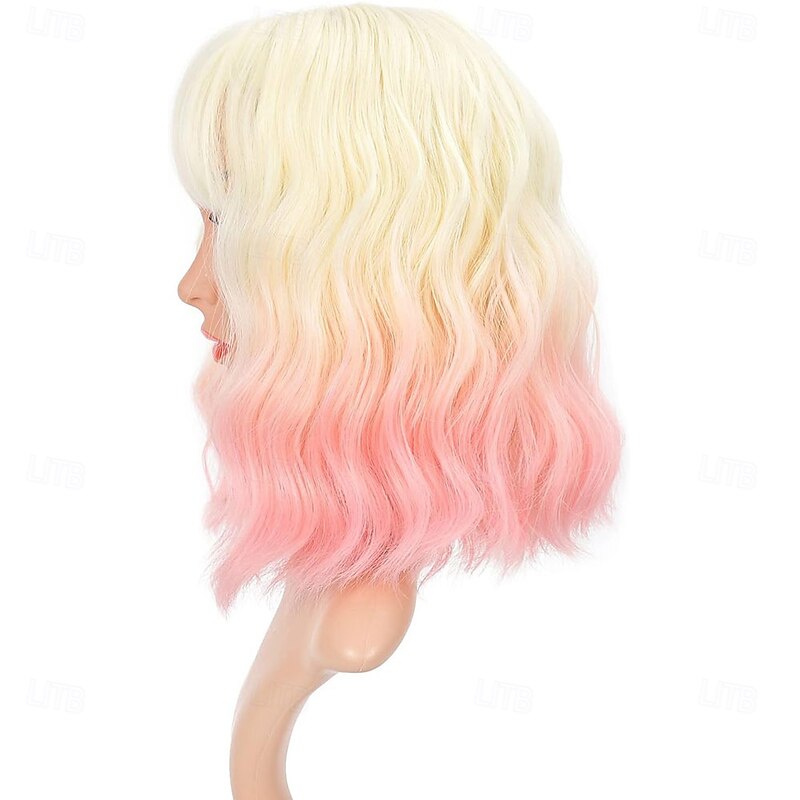 Ombre 2 Tone Color Curly Bob Wig With Air Bangs Natural Curly Wavy Short Bob Wigs Shoulder Length Wigs Synthetic Cosplay for Girl Colorful Wigs 12'' Blond to Pink 180.0 grams 1.0 count 10