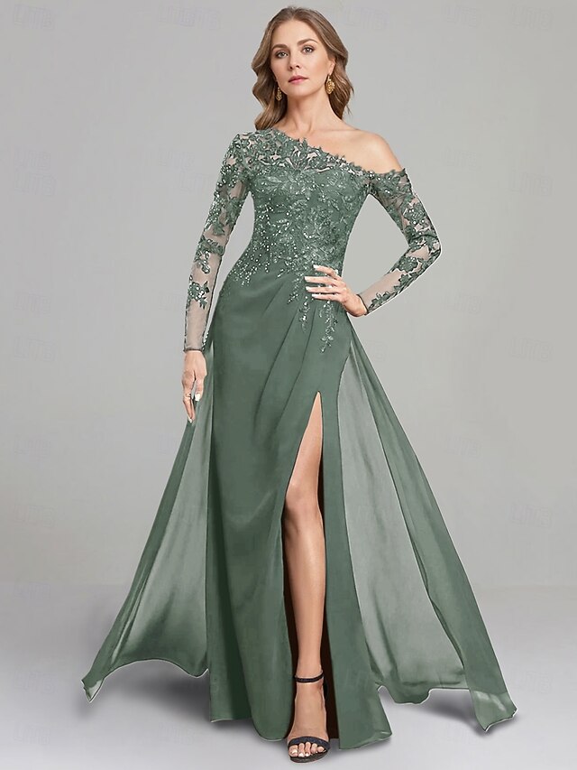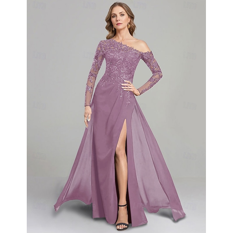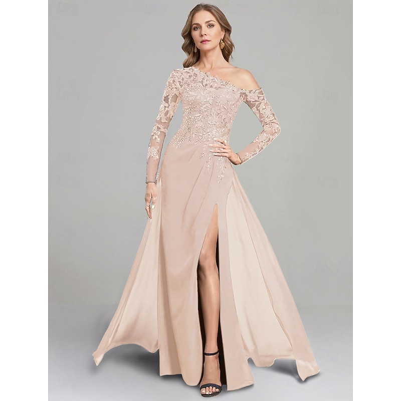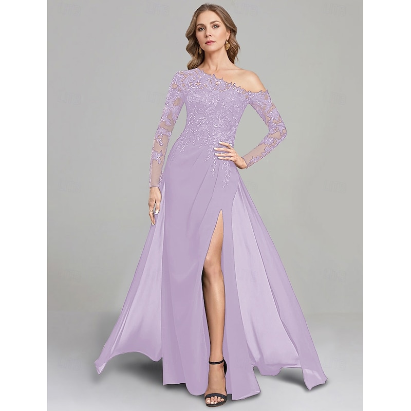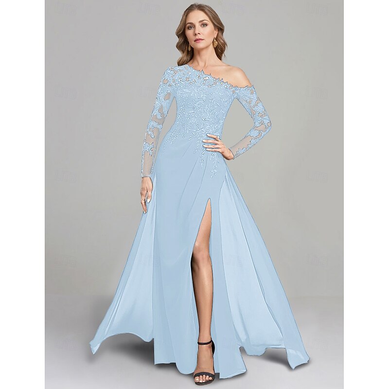 Sheath Dress Mother of the Bride Dress Formal Elegant One Shoulder Floor Length Chiffon Long Sleeve with Lace Solid Color