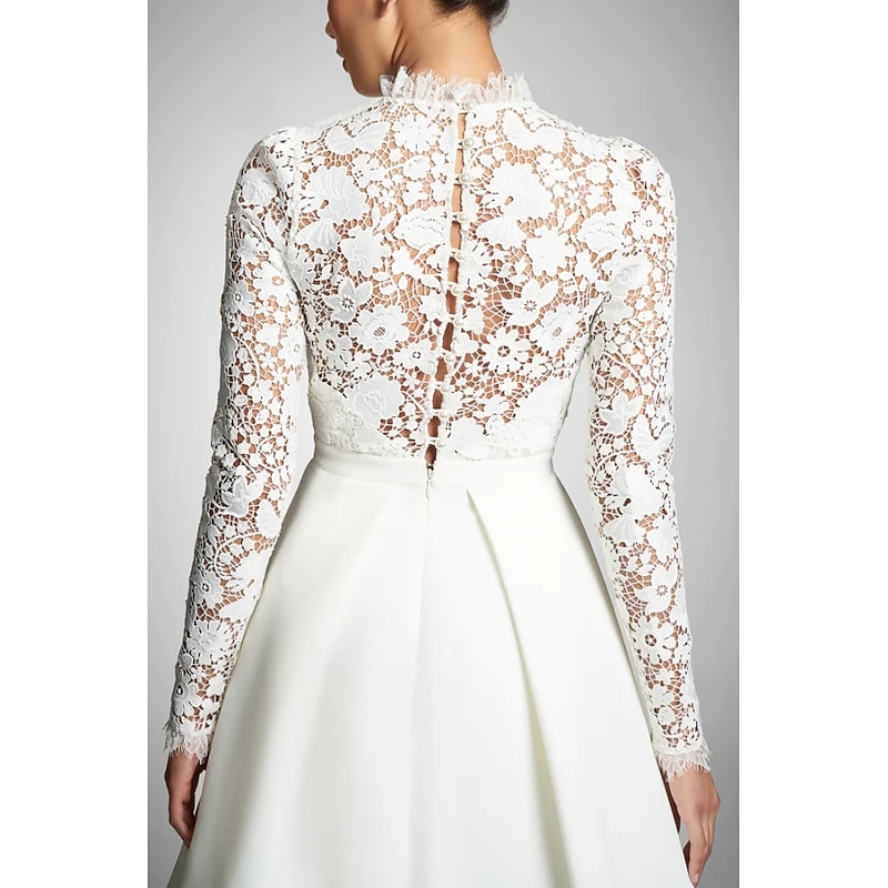 Highlights [Fabric] : Crafted from high-quality stretch fabric, this cocktail dress embodies elegance with its delicate lace bodice that extends into long sleeves and a sophisticated high neckline. The combination of lace and smooth fabric offers a breathable and comfortable fit, ensuring style and ease of wear. [Silhouette] : The dress features a classic A-line silhouette, which flares gently from the waist down, creating a timeless and flattering figure. The structured skirt, possibly made from satin or taffeta, is designed with graceful pleats that enhance volume and add movement with every step. [Design Highlights] : Exuding vintage charm, the intricate lacework and high neckline bring a refined, feminine touch to the dress. The pleats in the skirt provide a dynamic and elegant aspect, ensuring the dress sways beautifully as you move. [Occasions] : Perfectly suited for formal occasions and special events such as weddings, cocktail parties, and evening gatherings, this dress adds a touch of sophistication to any event. Its versatile design allows it to transition from day to night effortlessly. [Sizes] : Available in a wide range of sizes, including US 0 to US 26W, this dress offers a fit for various body types. Additionally, custom measurements ensure a perfect fit, tailored to individual preferences, making it an ideal choice for diverse wardrobe needs.
