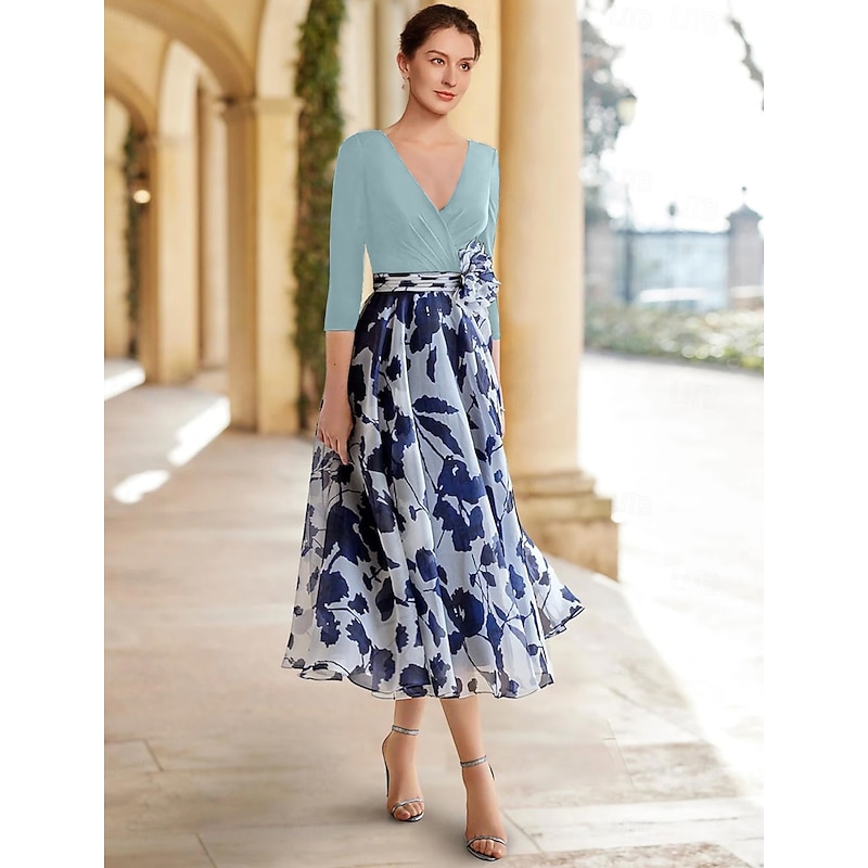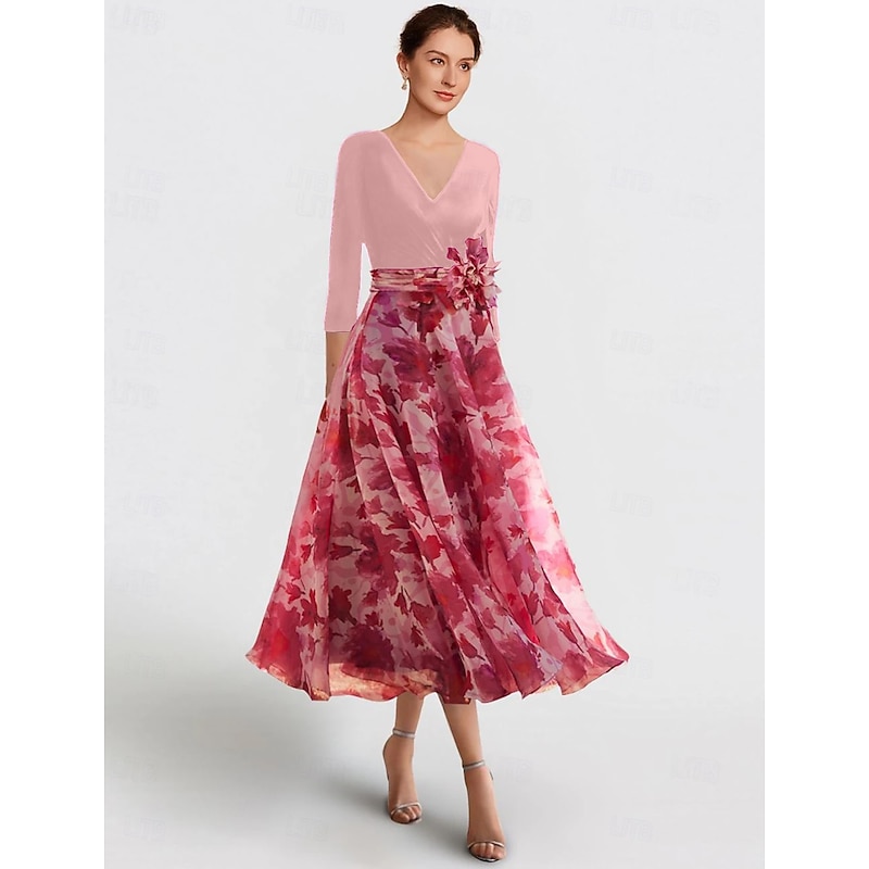 Beach Wedding A-Line Mother of the Bride Dress Formal Wedding Guest Elegant Scoop Neck V Neck Ankle Length Chiffon Sequined Stretch Fabric 3/4 Length Sleeve with Flower Wedding Guest Dress