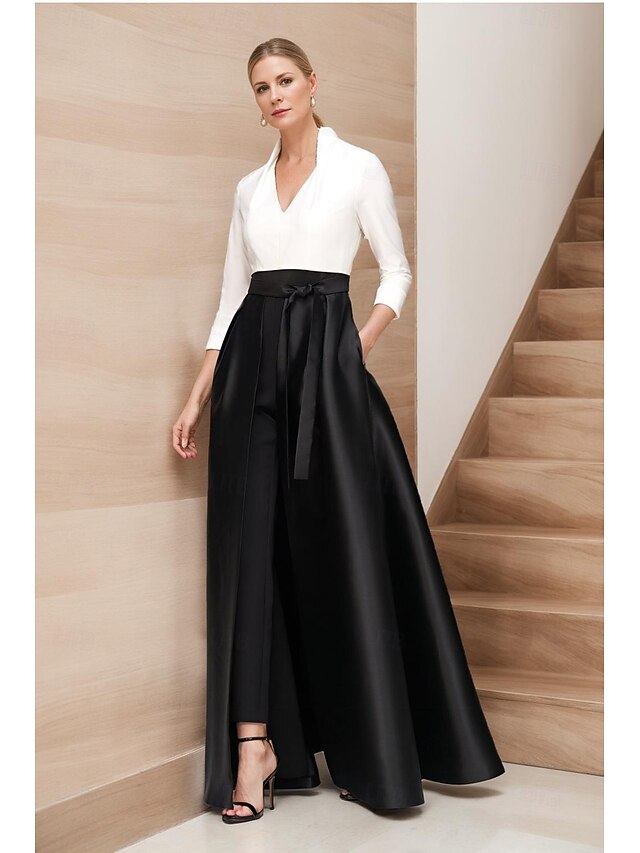 Why Choose A-Line Jumpsuit Mother of the Bride Black and White Elegant Simple Minimalist V Neck Floor Length Ankle Length Satin Sleeveless 3/4 Length Sleeve with Sash / Ribbon?
