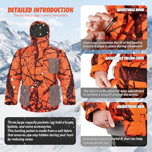 • Blaze Orange Camo: The blaze orange camouflage design, good for big game hunting, deer hunting, ducks hunting and other activities. The hem, cuffs and hood adjustment buckles are designed to offer a customized fit and keeps wind out.