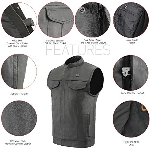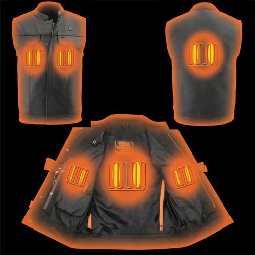Fabric type: LeatherCare instructions: Dry Clean OnlyOrigin: Imported✅ Made of 1.2-1.3mm Thick Made of Premium Naked Leather. COOLING: Cool-Tec Technology - Leather Treatment Designed to Keep Your Body 20-30 Degrees Fahrenheit Cooler Than the Outside Temperature. HEATED: 3 Heated Panels Intricately Placed Throughout the Vest in The Chest and Back to Keep You Warm While You Riding or Normal Wear✅ OUTSIDE FEATURES: Dual Front Zipper Closure and Snap Buttons with a Collarless Design + 2 Lower Hand Pockets with Snap Button Closure + 2 Outside Chest Pockets with Snap Button Closure (Left Pocket Has a Slit for Your Eyewear) + Quick Draw Gun Pocket (Quick Release + Plain Back Panel – Perfect for Patch or Embroidery✅ INSIDE FEATURES: Conceal Your Piece with Dual Inside Left and Right Gun or Ammo Pockets + Quick Draw Gun Pocket (Quick Release) + Built Inside Hanging Loop + Satin and Mesh Liner + Heated Panels Intricately Placed Throughout Chest and on The Back To Keep You Warm While Riding + Built In Waterproof Pocket Holds Portable Battery Pack + Inside Media Pocket w/ Wire Feed + Powered By 7.4V Rechargeable Battery (Included)✅ HEATED TECHNOLOGY: 3 Heated Panels Intricately Placed Throughout the Jacket in The Chest and Back to Keep You Warm While You Riding or Normal Wear + 3 Heat Settings: (Low-95f, Medium-105f, High-120f) + |Built in Waterproof Pocket Holds the On-The-Go Portable Battery Pack + Powered by 7.4V Rechargeable Battery (Included)✅ COOLING TECHNOLOGY: Cool-Tec Technology - Leather Treatment Designed to Keep Your Body 20-30 Degrees Fahrenheit Cooler Than the Outside Temperature. HEATED: 3 Heated Panels Intricately Placed Throughout the Vest in The Chest and Back to Keep You Warm While You Riding or Normal Wear Perfect for everyday use. High quality materials and excellent craftsmanship ensure long-lasting durability.