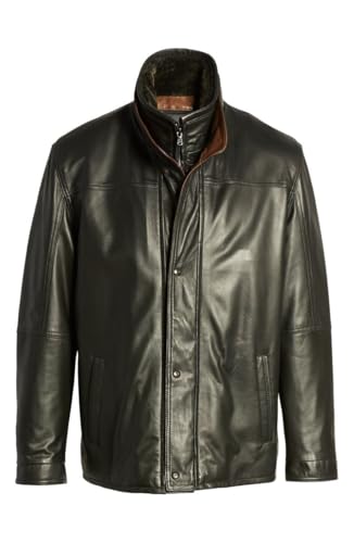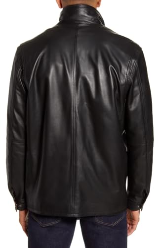 More information about Men's Black Leather Bomber Jacket with Brown Collar, Zipper Closure, and Button Detailing.