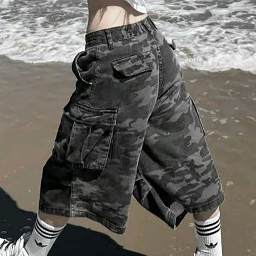 Summer Vintage Camo High Waisted Baggy Wide Leg Jeans Unisex Work Pocket Cargo Capris Short Pants for Women 6