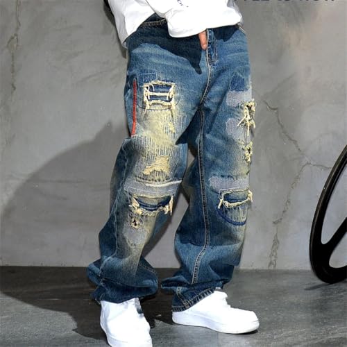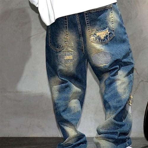HOT ! Men’S Streetwear Straight Baggy Denim Cargo Pants Midweight Distressed Fashion Trousers Full Length Jeans