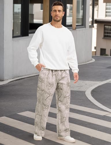 • Design: Camo fleece joggers men with wide leg and open bottom design ensure a relaxed fit with easy movement, making these sweatpants perfect for casual, workout or lounging wear. Mens camo sweatpants open bottom adorned with realistic branch and maple leaf print, the combination of prints creates a visually appealing contrast, infuse a touch of nature's elegance into the urban camo design
