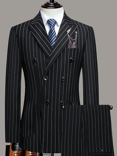 Mens Double Breasted Pinstripe Suit- 2 Piece Slim Fit Stripe Tuxedo,Business Wedding Dinner Party Jacket Pants Suit Set 2
