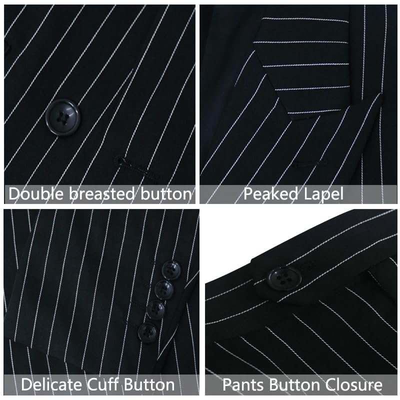 • Vintage Elegance: This men doulbe breasted suit with its slim fit and vintage-inspired design, this suit is perfect for making a stylish statement. The black and white pinstripes add a touch of classic elegance, making it suitable for formal events and special occasions