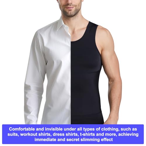 • [INSTANTLY SECRET SLIMMING] This men compression tank top offers a snug fit, providing an immediate slimming effect under all types of clothing, perfect for suits, workout shirts, dress shirts, t-shirts and more. Comfortable and invisible, the slimming body shaper vest is a secret between you and your garment, get your self-esteem back in a second