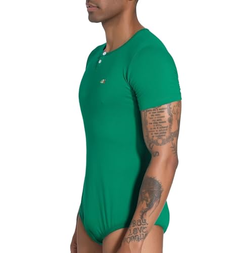 • Mens short sleeve romper t-shirt pajama top, one piece leotard bodysuit design, with snap button at crotch, easy for put on or take off. Button open collar adds a unique touch to the bodysuit.